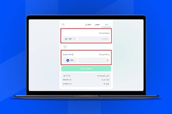 در قسمت «دریافت میکنم» میتوانید ارز دیجیتال مد نظر خود و تعداد مورد نظر را انتخاب کنید. در قسمت «پرداخت میکنم» نیز میتوانید ارز پرداختی را مشخص کنید که بهصورت پیشفرض «تومان» است. با تایید مبلغ و کلیک روی دکمه «خرید»، مراحل خرید تتر تکمیل میشود.